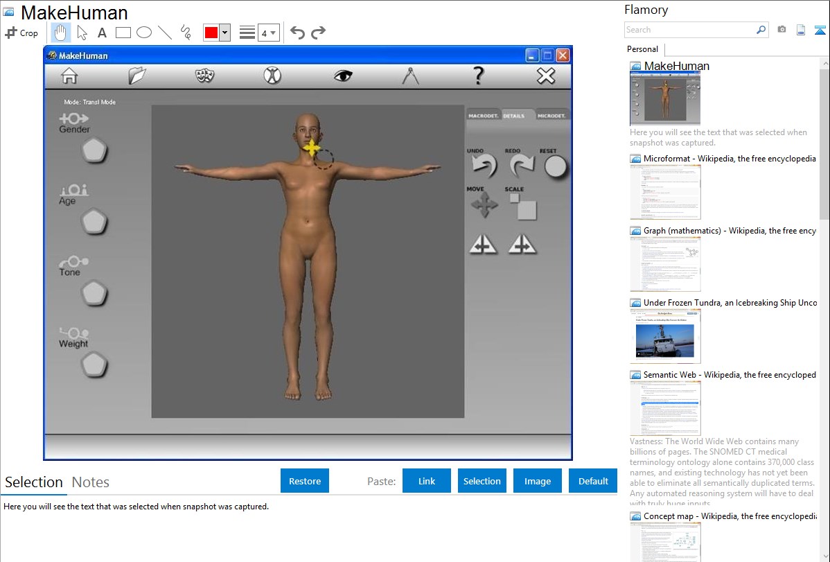 Flamory helps you capture and store screenshots from MakeHuman by pressing a single hotkey. It will be saved to a history, so you can continue doing your tasks without interruptions. Later, you can edit the screenshot: crop, resize, add labels and highlights. After that, you can paste the screenshot into any other document or e-mail message.