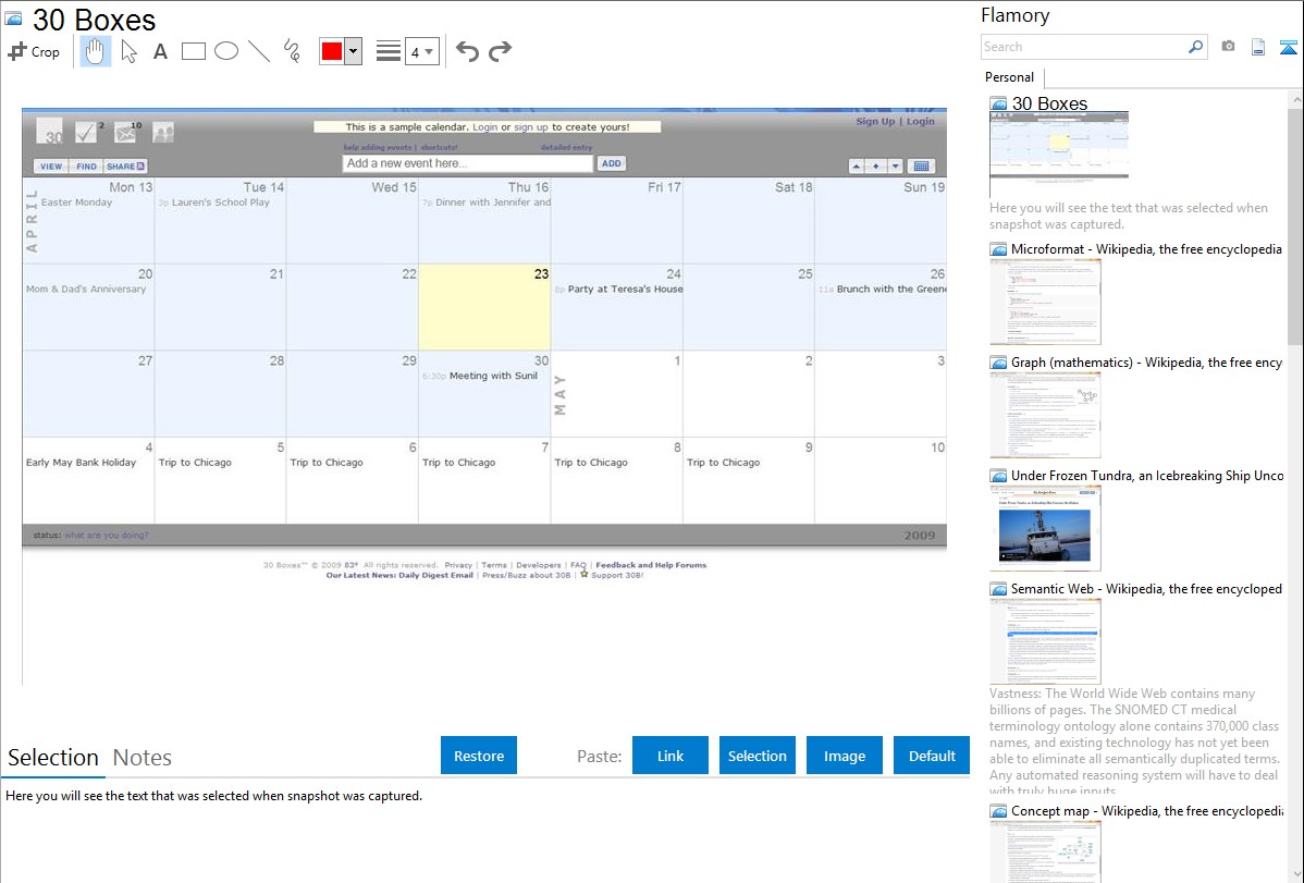 Flamory provides advanced bookmarking for 30 Boxes. It captures screen, selection, text on the page and other context. You can find this bookmark later using search by page content or looking through thumbnail list.