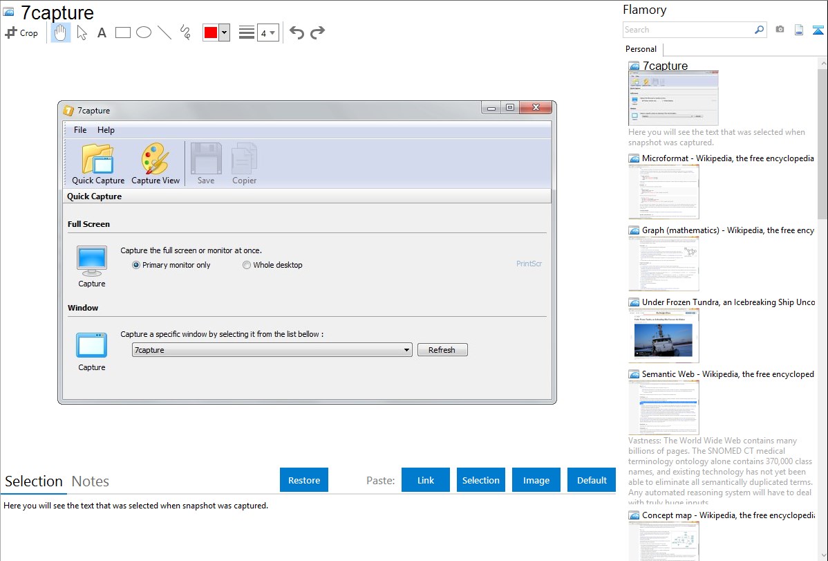 Flamory helps you capture and store screenshots from 7capture by pressing a single hotkey. It will be saved to a history, so you can continue doing your tasks without interruptions. Later, you can edit the screenshot: crop, resize, add labels and highlights. After that, you can paste the screenshot into any other document or e-mail message.