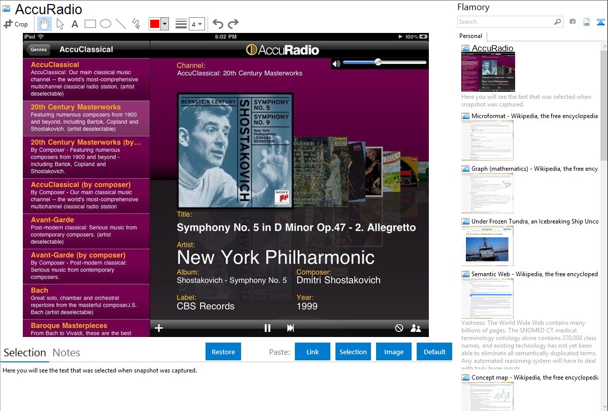 Flamory helps you capture and store screenshots from AccuRadio by pressing a single hotkey. It will be saved to a history, so you can continue doing your tasks without interruptions. Later, you can edit the screenshot: crop, resize, add labels and highlights. After that, you can paste the screenshot into any other document or e-mail message.