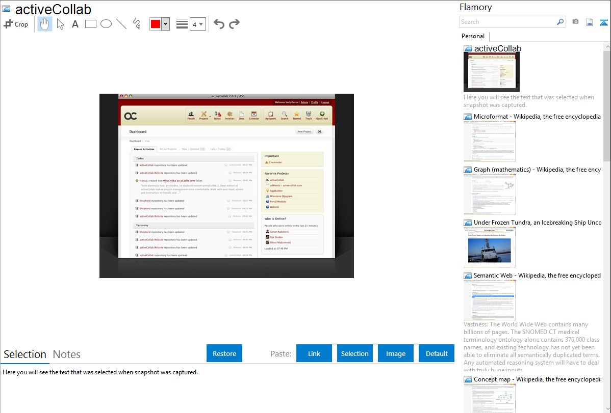 Flamory helps you capture and store screenshots from activeCollab by pressing a single hotkey. It will be saved to a history, so you can continue doing your tasks without interruptions. Later, you can edit the screenshot: crop, resize, add labels and highlights. After that, you can paste the screenshot into any other document or e-mail message.