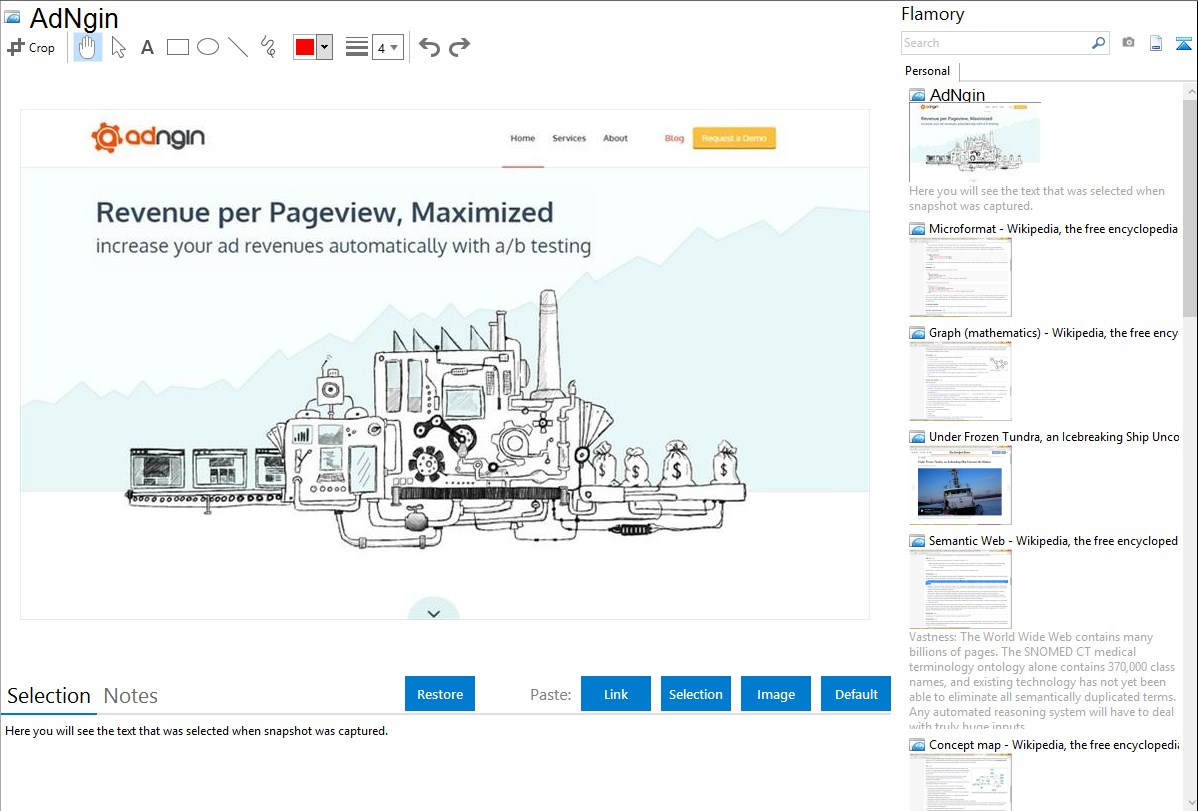Flamory helps you capture and store screenshots from AdNgin by pressing a single hotkey. It will be saved to a history, so you can continue doing your tasks without interruptions. Later, you can edit the screenshot: crop, resize, add labels and highlights. After that, you can paste the screenshot into any other document or e-mail message.