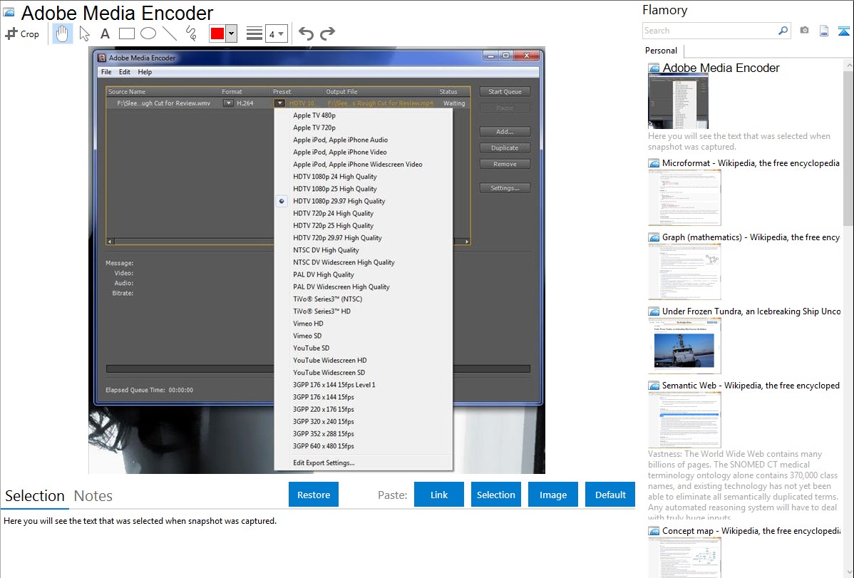 Flamory helps you capture and store screenshots from Adobe Media Encoder by pressing a single hotkey. It will be saved to a history, so you can continue doing your tasks without interruptions. Later, you can edit the screenshot: crop, resize, add labels and highlights. After that, you can paste the screenshot into any other document or e-mail message.