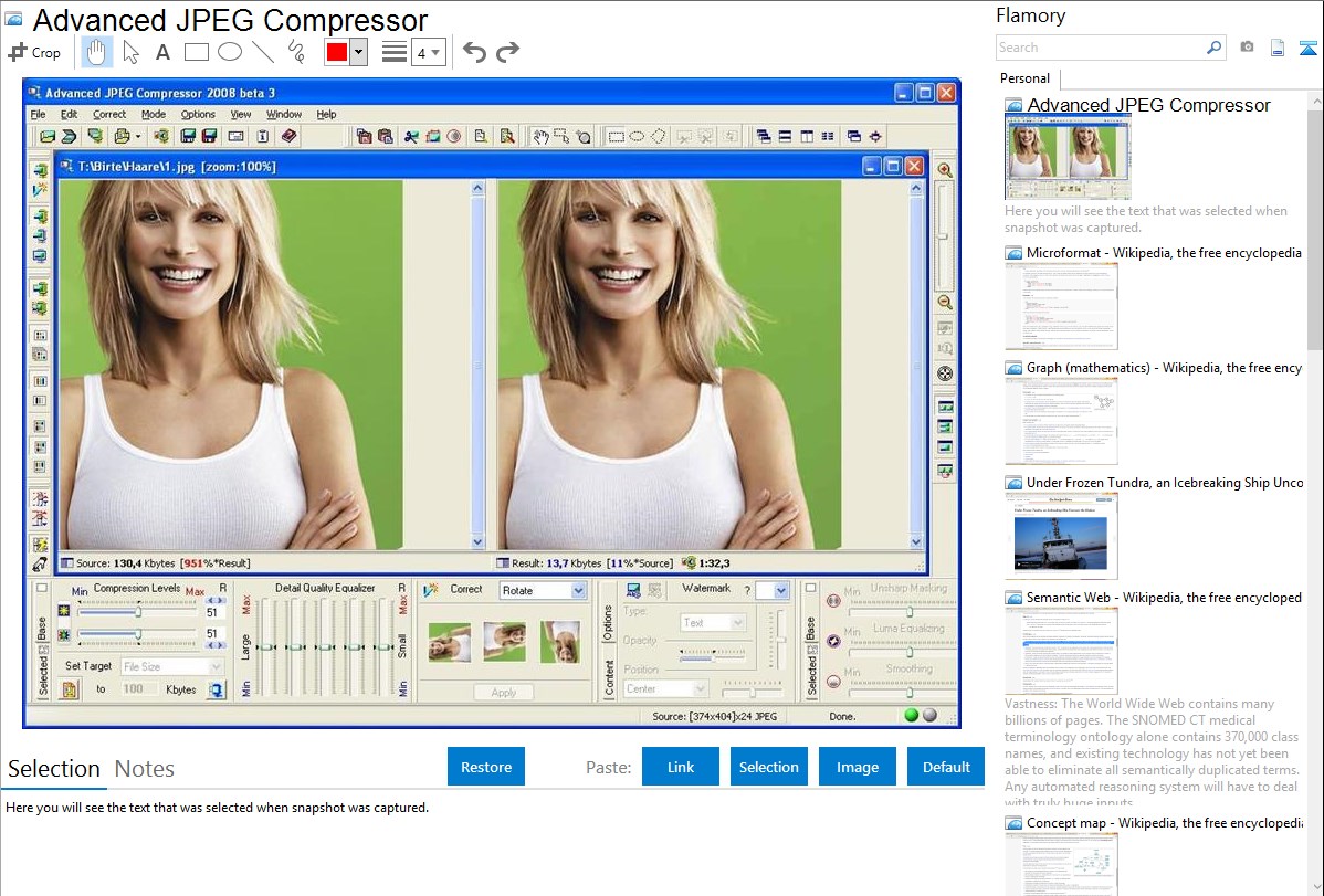 Flamory provides advanced bookmarking for Advanced JPEG Compressor. It captures screen, selection, text of the document and other context. You can find this bookmark later using search by document content or looking through thumbnail list.