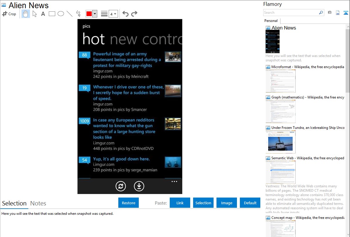 Flamory helps you capture and store screenshots from Alien News by pressing a single hotkey. It will be saved to a history, so you can continue doing your tasks without interruptions. Later, you can edit the screenshot: crop, resize, add labels and highlights. After that, you can paste the screenshot into any other document or e-mail message.