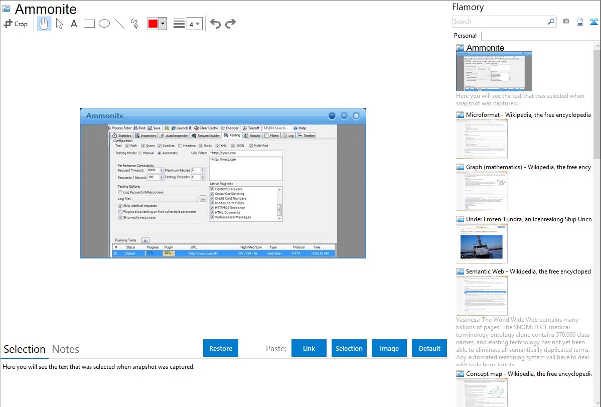 Flamory helps you capture and store screenshots from Ammonite by pressing a single hotkey. It will be saved to a history, so you can continue doing your tasks without interruptions. Later, you can edit the screenshot: crop, resize, add labels and highlights. After that, you can paste the screenshot into any other document or e-mail message.