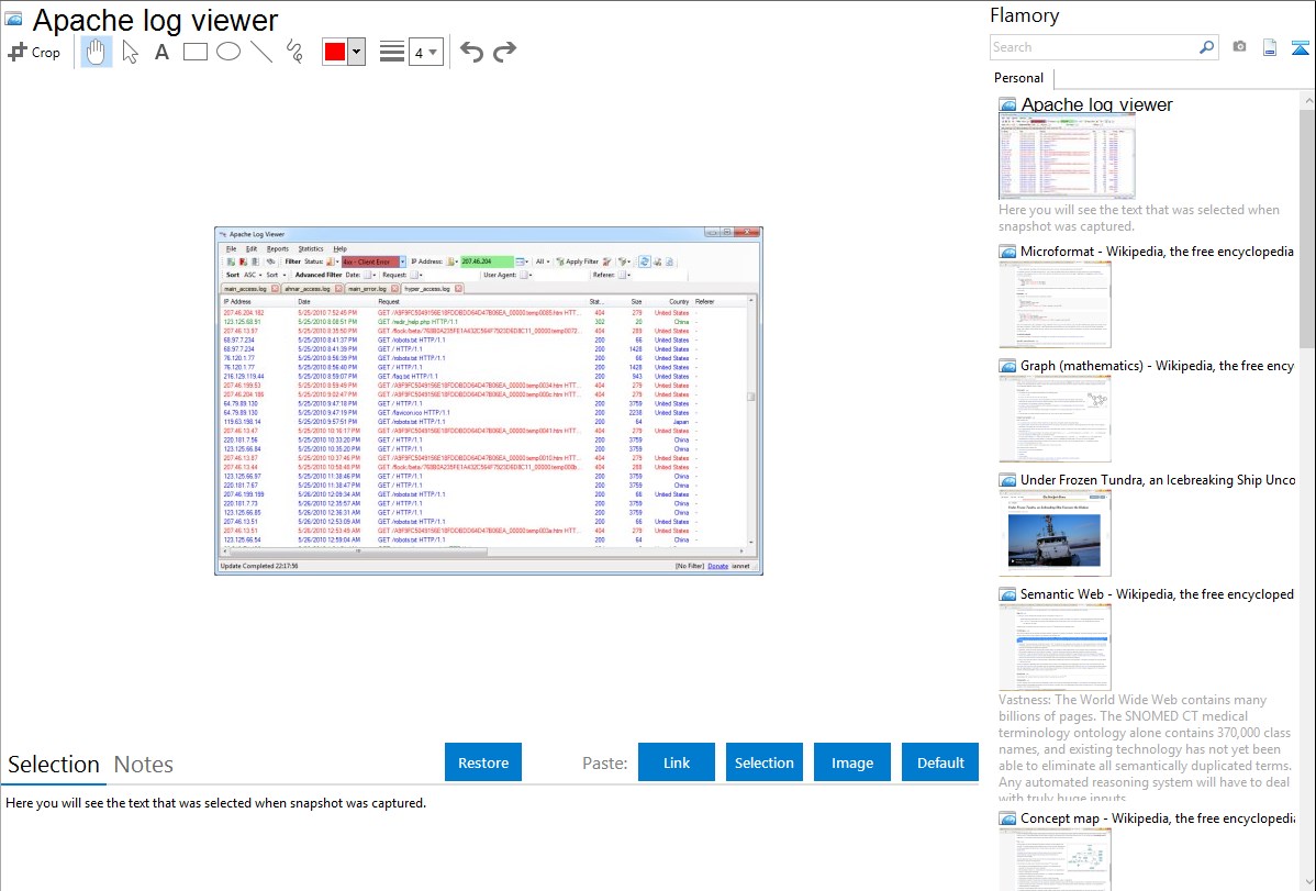 Flamory helps you capture and store screenshots from Apache log viewer by pressing a single hotkey. It will be saved to a history, so you can continue doing your tasks without interruptions. Later, you can edit the screenshot: crop, resize, add labels and highlights. After that, you can paste the screenshot into any other document or e-mail message.
