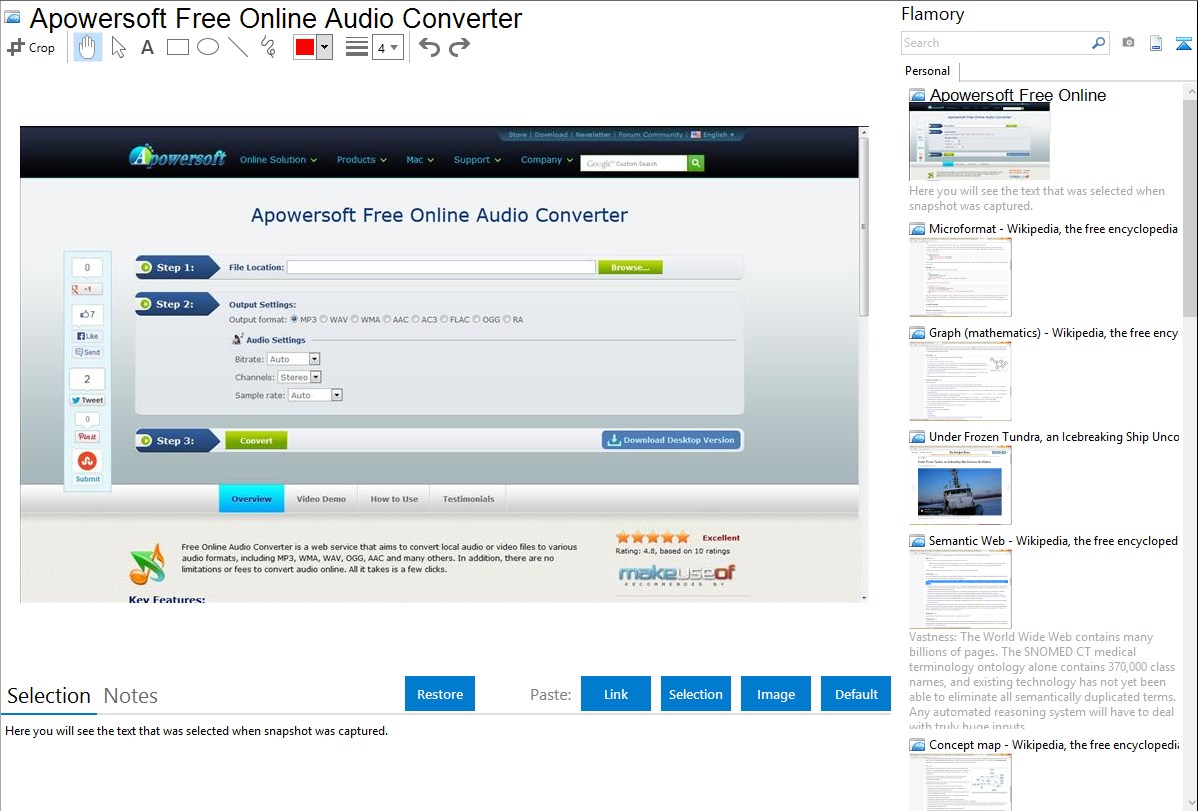 Flamory provides advanced bookmarking for Apowersoft Free Online Audio Converter. It captures screen, selection, text on the page and other context. You can find this bookmark later using search by page content or looking through thumbnail list.
