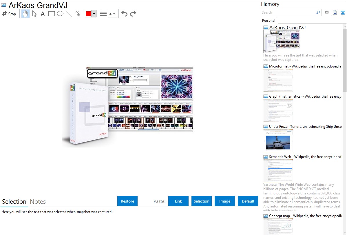 Flamory helps you capture and store screenshots from ArKaos GrandVJ by pressing a single hotkey. It will be saved to a history, so you can continue doing your tasks without interruptions. Later, you can edit the screenshot: crop, resize, add labels and highlights. After that, you can paste the screenshot into any other document or e-mail message.