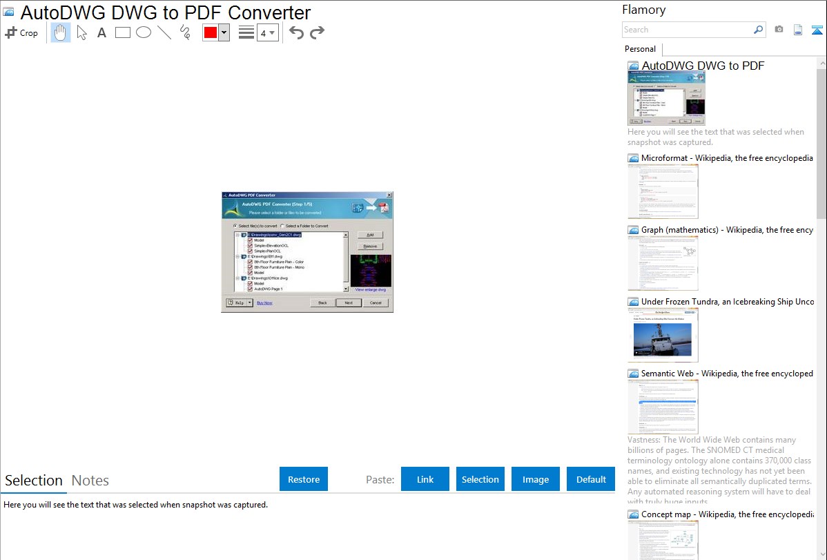 Flamory helps you capture and store screenshots from AutoDWG DWG to PDF Converter by pressing a single hotkey. It will be saved to a history, so you can continue doing your tasks without interruptions. Later, you can edit the screenshot: crop, resize, add labels and highlights. After that, you can paste the screenshot into any other document or e-mail message.