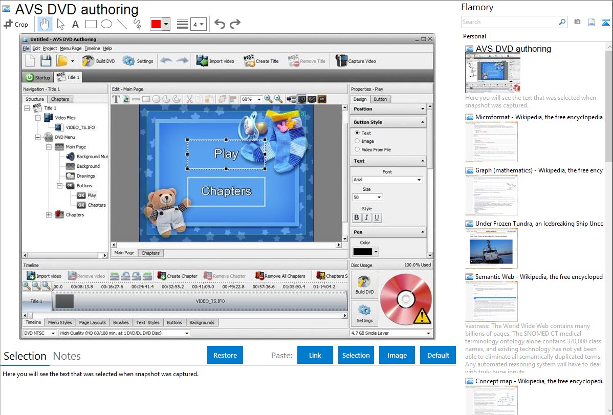 Flamory provides advanced bookmarking for AVS DVD authoring. It captures screen, selection, text of the document and other context. You can find this bookmark later using search by document content or looking through thumbnail list.