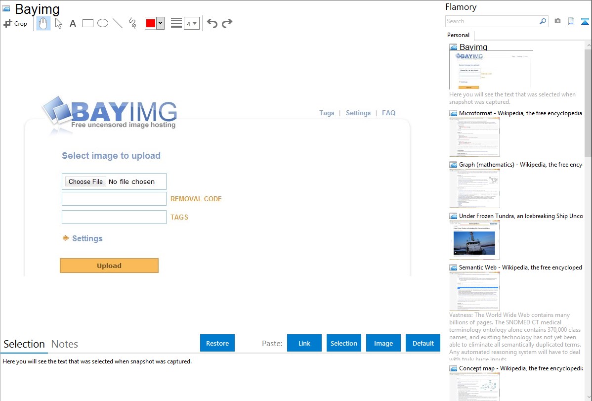 Flamory helps you capture and store screenshots from Bayimg by pressing a single hotkey. It will be saved to a history, so you can continue doing your tasks without interruptions. Later, you can edit the screenshot: crop, resize, add labels and highlights. After that, you can paste the screenshot into any other document or e-mail message.