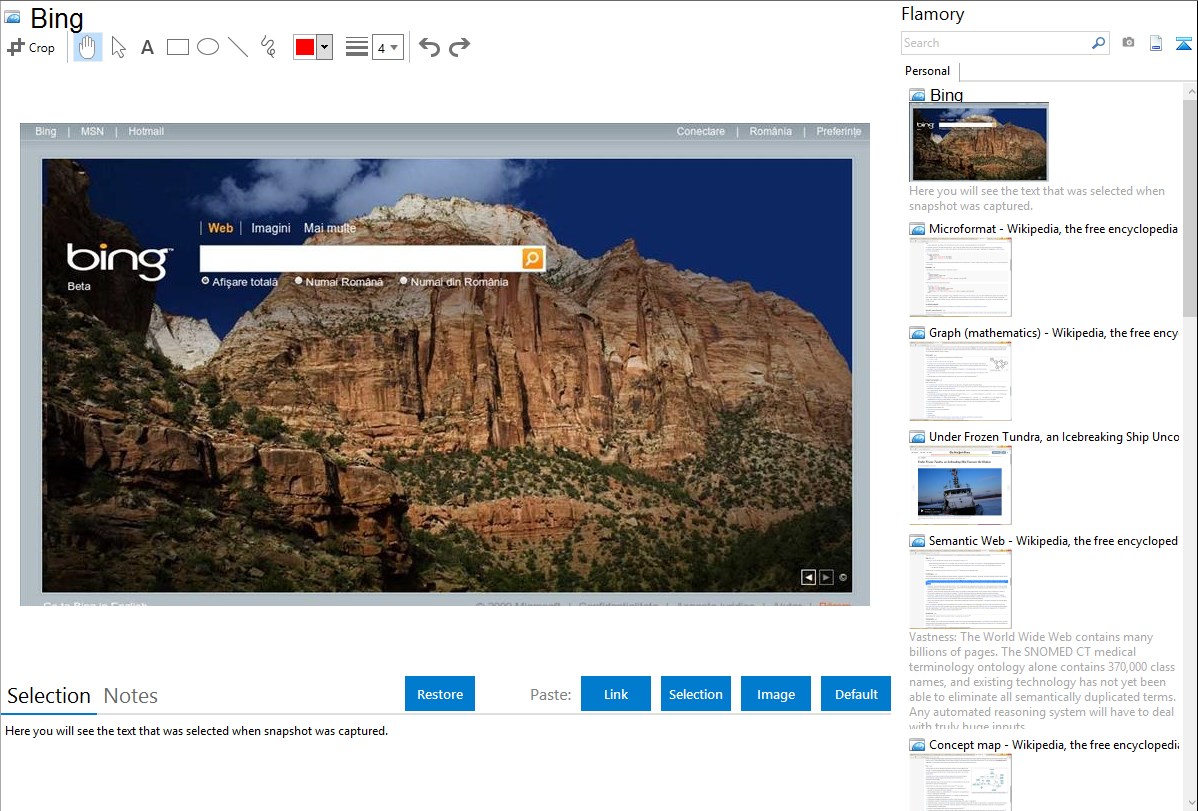 Flamory helps you capture and store screenshots from Bing by pressing a single hotkey. It will be saved to a history, so you can continue doing your tasks without interruptions. Later, you can edit the screenshot: crop, resize, add labels and highlights. After that, you can paste the screenshot into any other document or e-mail message.