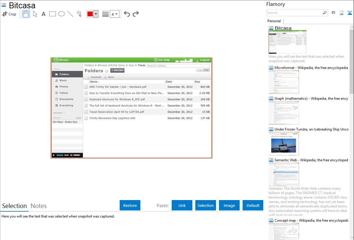 Flamory helps you capture and store screenshots from Bitcasa by pressing a single hotkey. It will be saved to a history, so you can continue doing your tasks without interruptions. Later, you can edit the screenshot: crop, resize, add labels and highlights. After that, you can paste the screenshot into any other document or e-mail message.