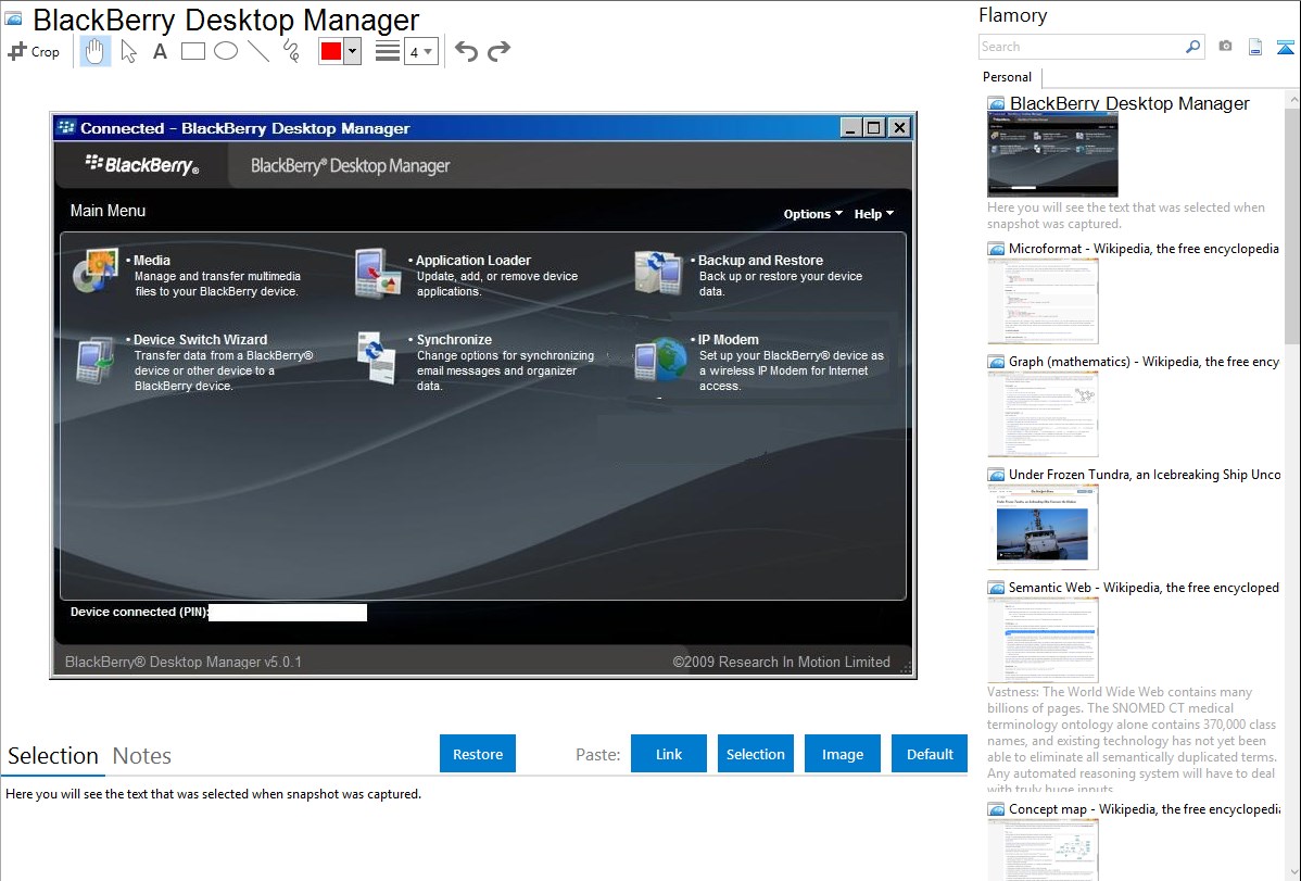 Flamory helps you capture and store screenshots from BlackBerry Desktop Manager by pressing a single hotkey. It will be saved to a history, so you can continue doing your tasks without interruptions. Later, you can edit the screenshot: crop, resize, add labels and highlights. After that, you can paste the screenshot into any other document or e-mail message.