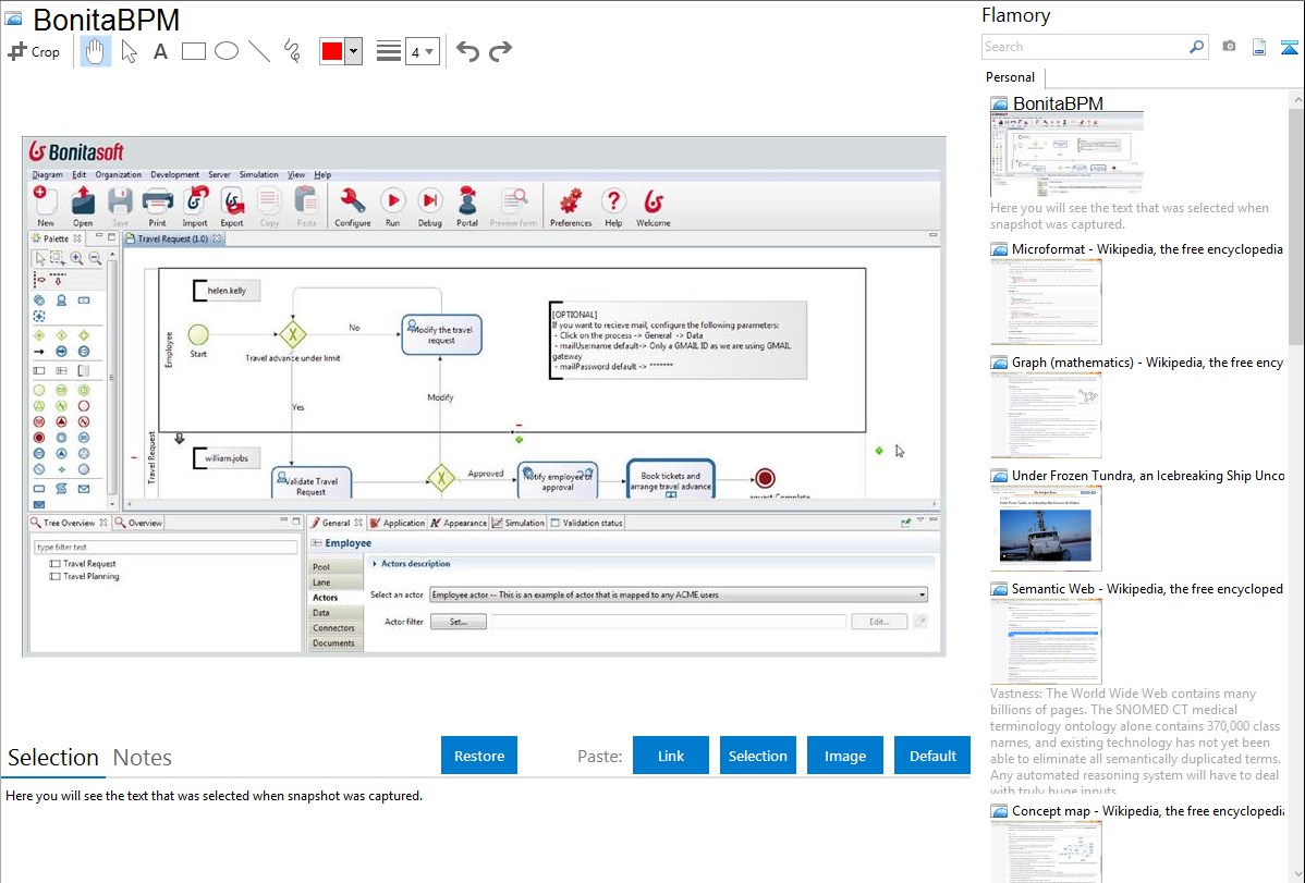Flamory helps you capture and store screenshots from BonitaBPM by pressing a single hotkey. It will be saved to a history, so you can continue doing your tasks without interruptions. Later, you can edit the screenshot: crop, resize, add labels and highlights. After that, you can paste the screenshot into any other document or e-mail message.