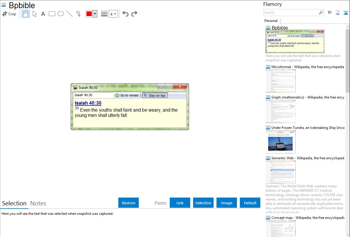 Flamory helps you capture and store screenshots from Bpbible by pressing a single hotkey. It will be saved to a history, so you can continue doing your tasks without interruptions. Later, you can edit the screenshot: crop, resize, add labels and highlights. After that, you can paste the screenshot into any other document or e-mail message.