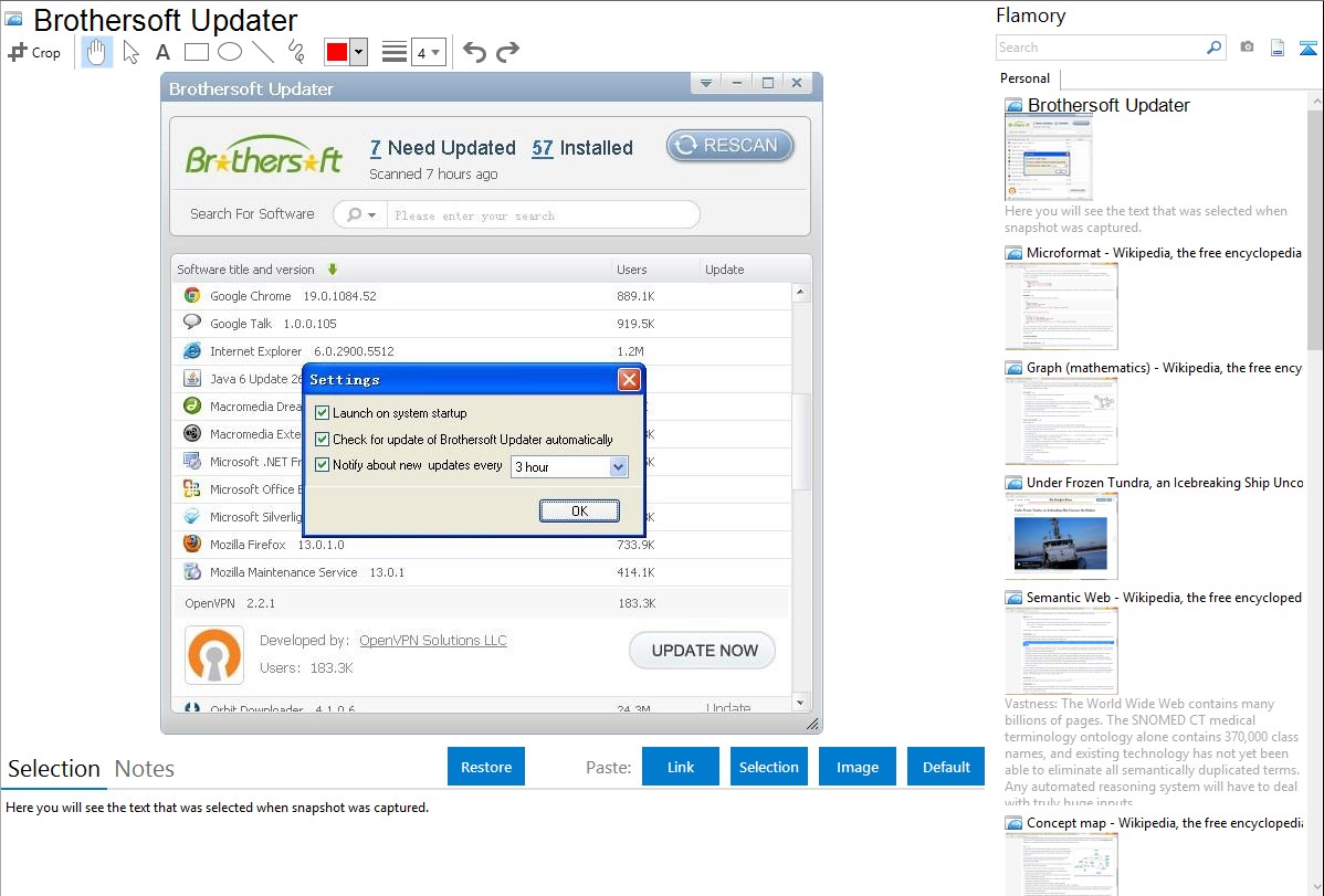 Flamory helps you capture and store screenshots from Brothersoft Updater by pressing a single hotkey. It will be saved to a history, so you can continue doing your tasks without interruptions. Later, you can edit the screenshot: crop, resize, add labels and highlights. After that, you can paste the screenshot into any other document or e-mail message.