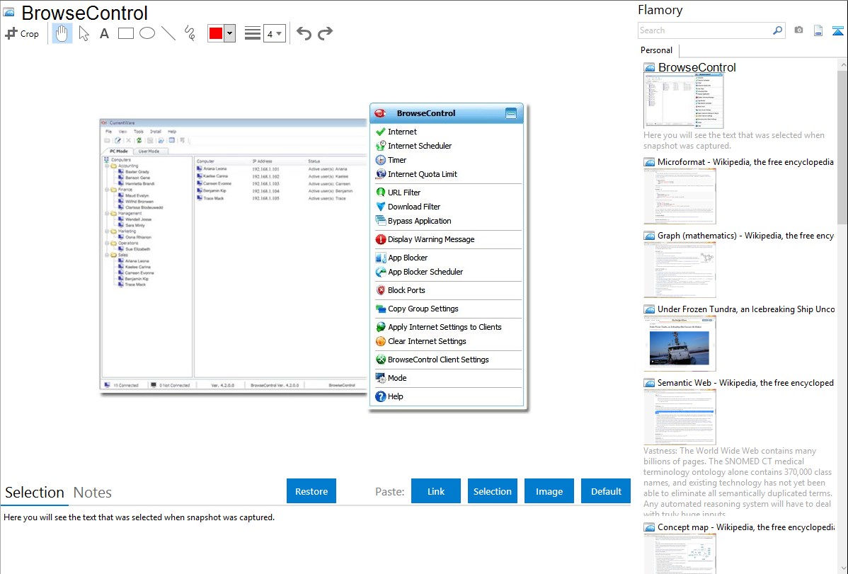 Flamory helps you capture and store screenshots from BrowseControl by pressing a single hotkey. It will be saved to a history, so you can continue doing your tasks without interruptions. Later, you can edit the screenshot: crop, resize, add labels and highlights. After that, you can paste the screenshot into any other document or e-mail message.