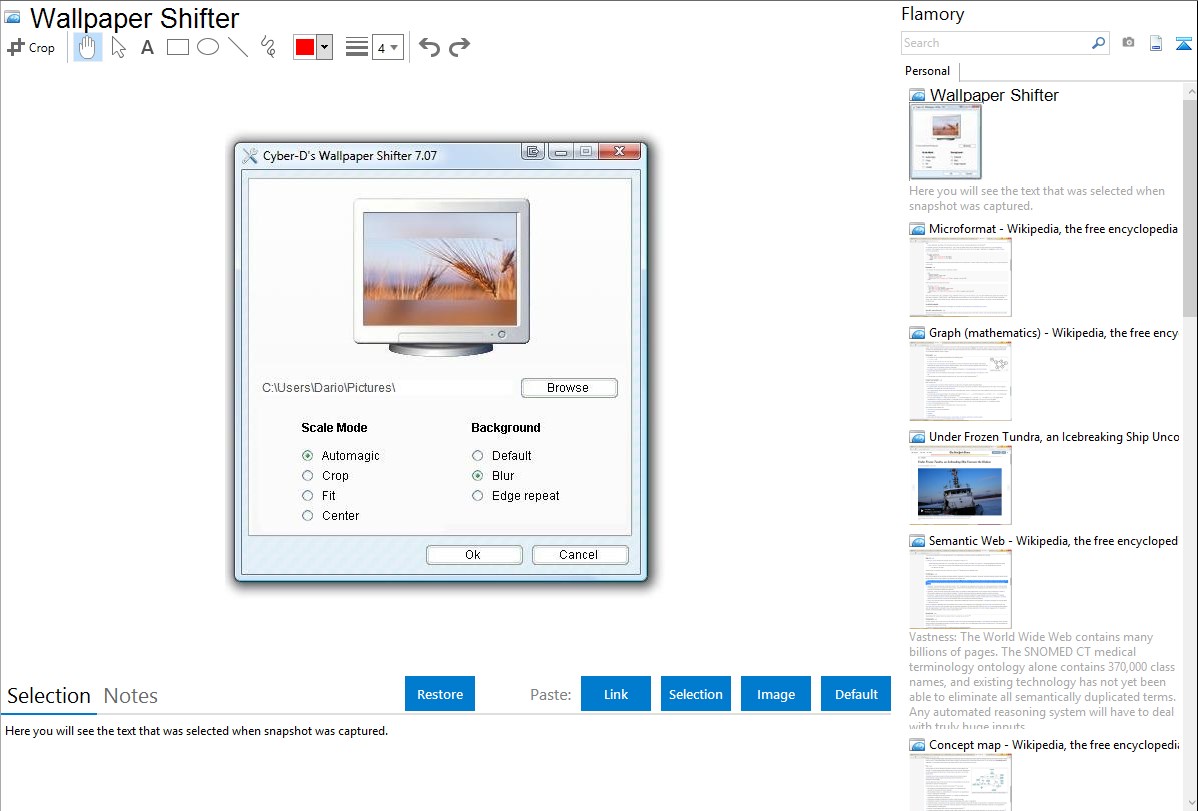 Flamory helps you capture and store screenshots from Wallpaper Shifter by pressing a single hotkey. It will be saved to a history, so you can continue doing your tasks without interruptions. Later, you can edit the screenshot: crop, resize, add labels and highlights. After that, you can paste the screenshot into any other document or e-mail message.