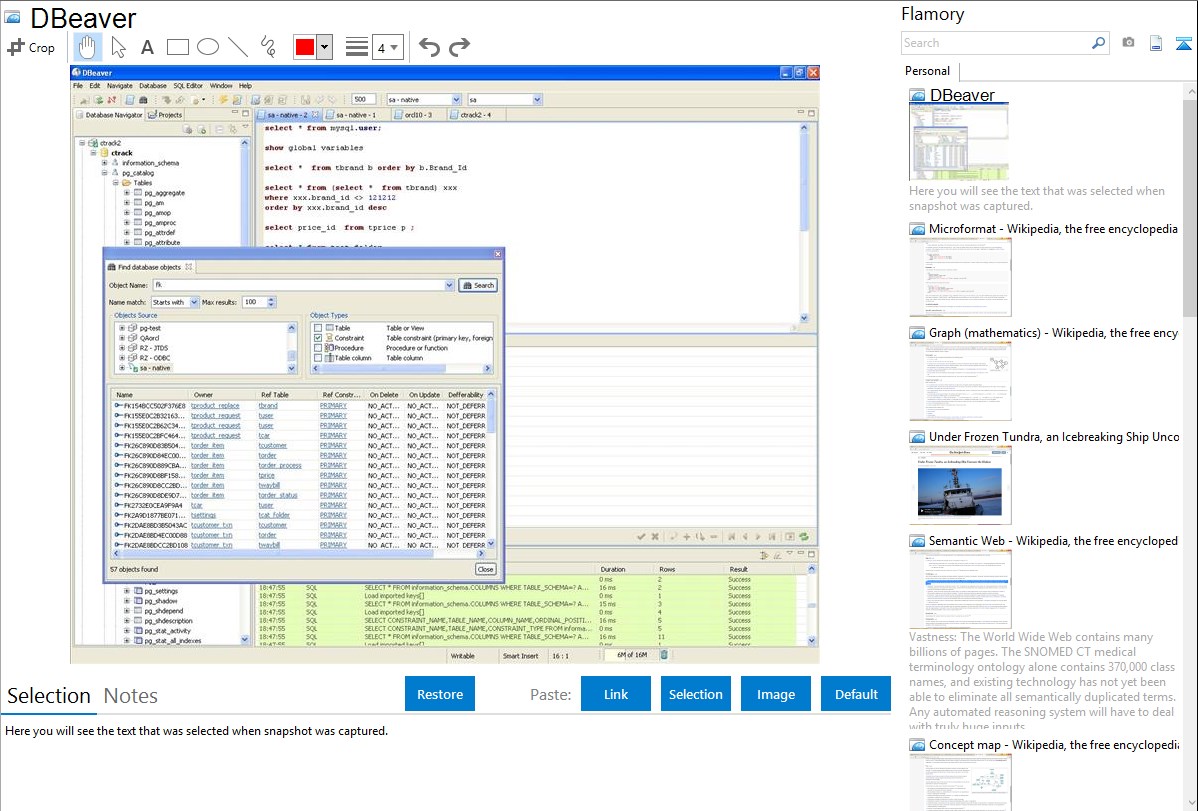 Flamory helps you capture and store screenshots from DBeaver by pressing a single hotkey. It will be saved to a history, so you can continue doing your tasks without interruptions. Later, you can edit the screenshot: crop, resize, add labels and highlights. After that, you can paste the screenshot into any other document or e-mail message.