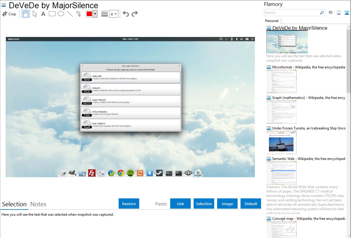 Flamory helps you capture and store screenshots from DeVeDe by MajorSilence by pressing a single hotkey. It will be saved to a history, so you can continue doing your tasks without interruptions. Later, you can edit the screenshot: crop, resize, add labels and highlights. After that, you can paste the screenshot into any other document or e-mail message.