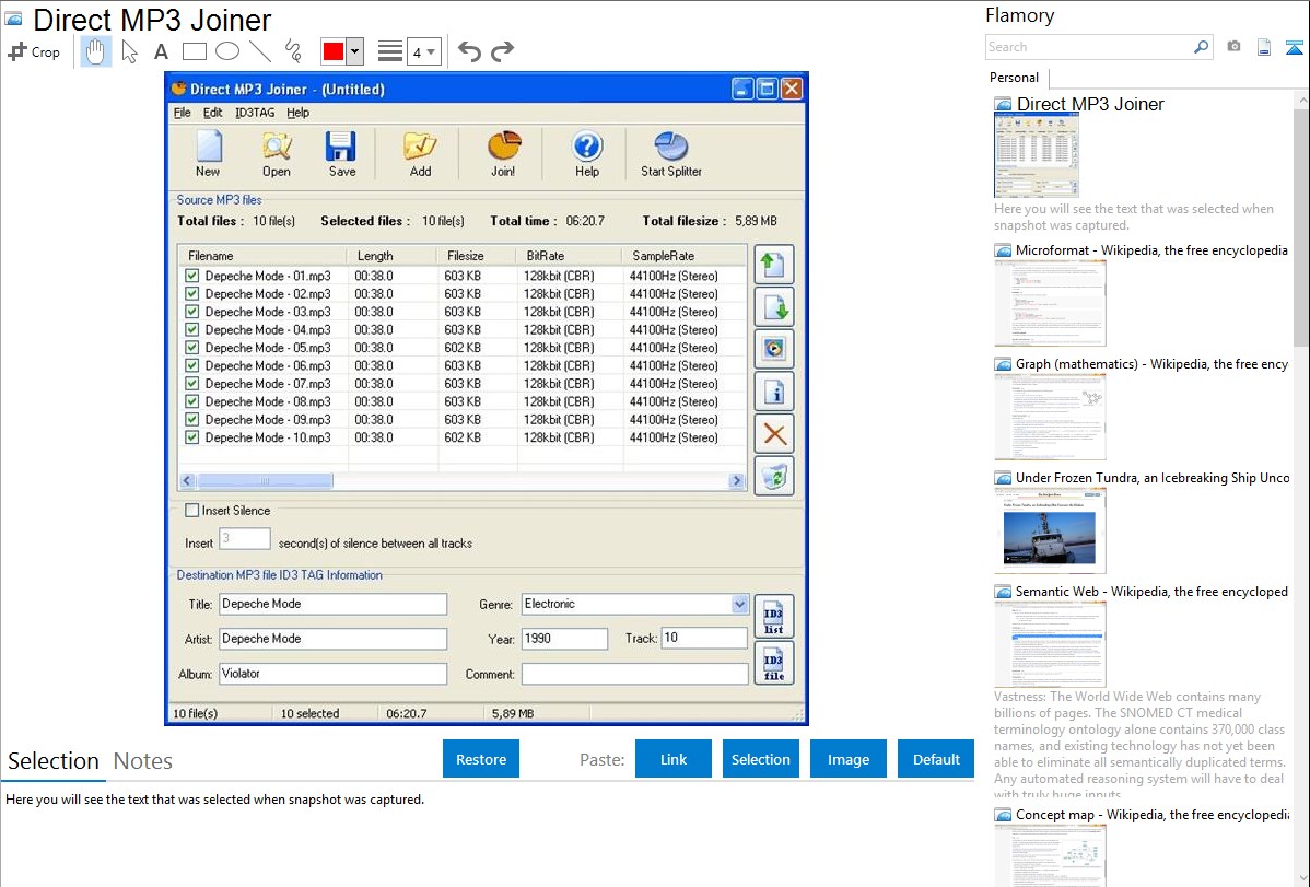 Flamory helps you capture and store screenshots from Direct MP3 Joiner by pressing a single hotkey. It will be saved to a history, so you can continue doing your tasks without interruptions. Later, you can edit the screenshot: crop, resize, add labels and highlights. After that, you can paste the screenshot into any other document or e-mail message.