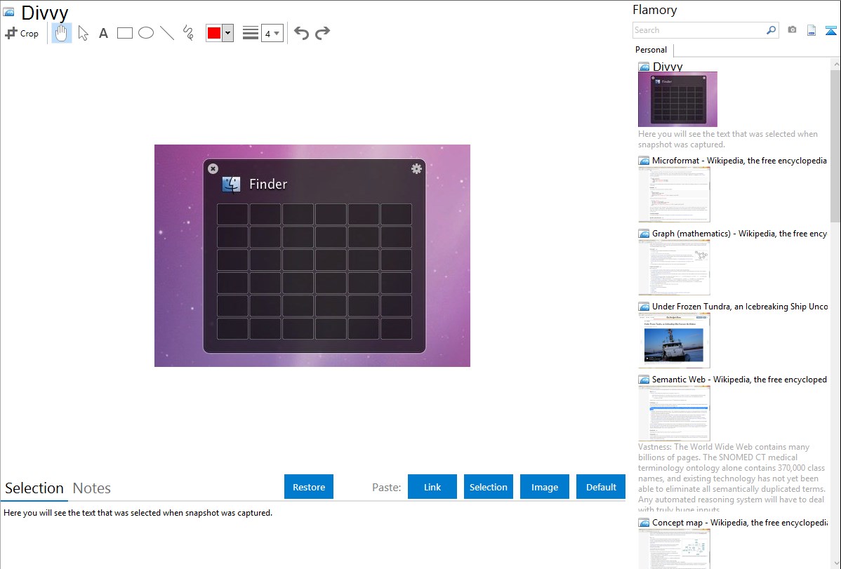 Flamory helps you capture and store screenshots from Divvy by pressing a single hotkey. It will be saved to a history, so you can continue doing your tasks without interruptions. Later, you can edit the screenshot: crop, resize, add labels and highlights. After that, you can paste the screenshot into any other document or e-mail message.