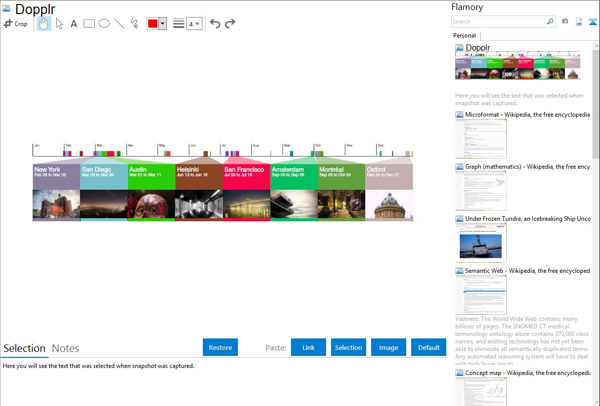 Flamory helps you capture and store screenshots from Dopplr by pressing a single hotkey. It will be saved to a history, so you can continue doing your tasks without interruptions. Later, you can edit the screenshot: crop, resize, add labels and highlights. After that, you can paste the screenshot into any other document or e-mail message.