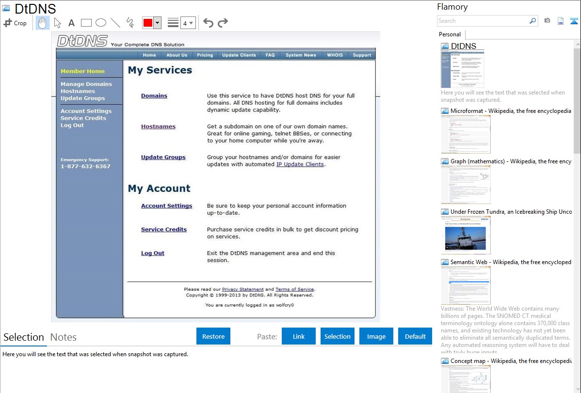 Flamory helps you capture and store screenshots from DtDNS by pressing a single hotkey. It will be saved to a history, so you can continue doing your tasks without interruptions. Later, you can edit the screenshot: crop, resize, add labels and highlights. After that, you can paste the screenshot into any other document or e-mail message.