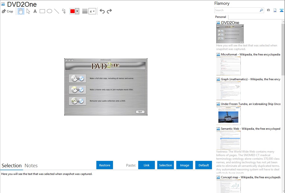 Flamory helps you capture and store screenshots from DVD2One by pressing a single hotkey. It will be saved to a history, so you can continue doing your tasks without interruptions. Later, you can edit the screenshot: crop, resize, add labels and highlights. After that, you can paste the screenshot into any other document or e-mail message.