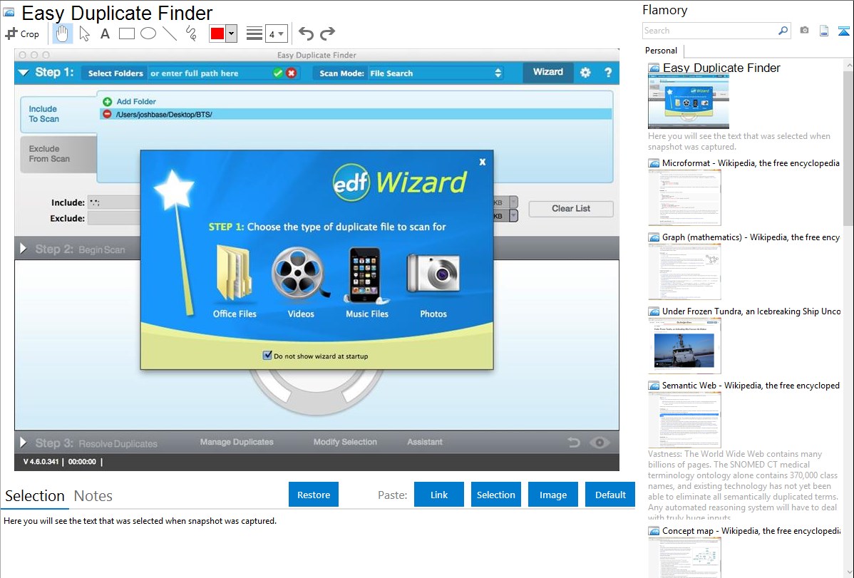 Flamory helps you capture and store screenshots from Easy Duplicate Finder by pressing a single hotkey. It will be saved to a history, so you can continue doing your tasks without interruptions. Later, you can edit the screenshot: crop, resize, add labels and highlights. After that, you can paste the screenshot into any other document or e-mail message.