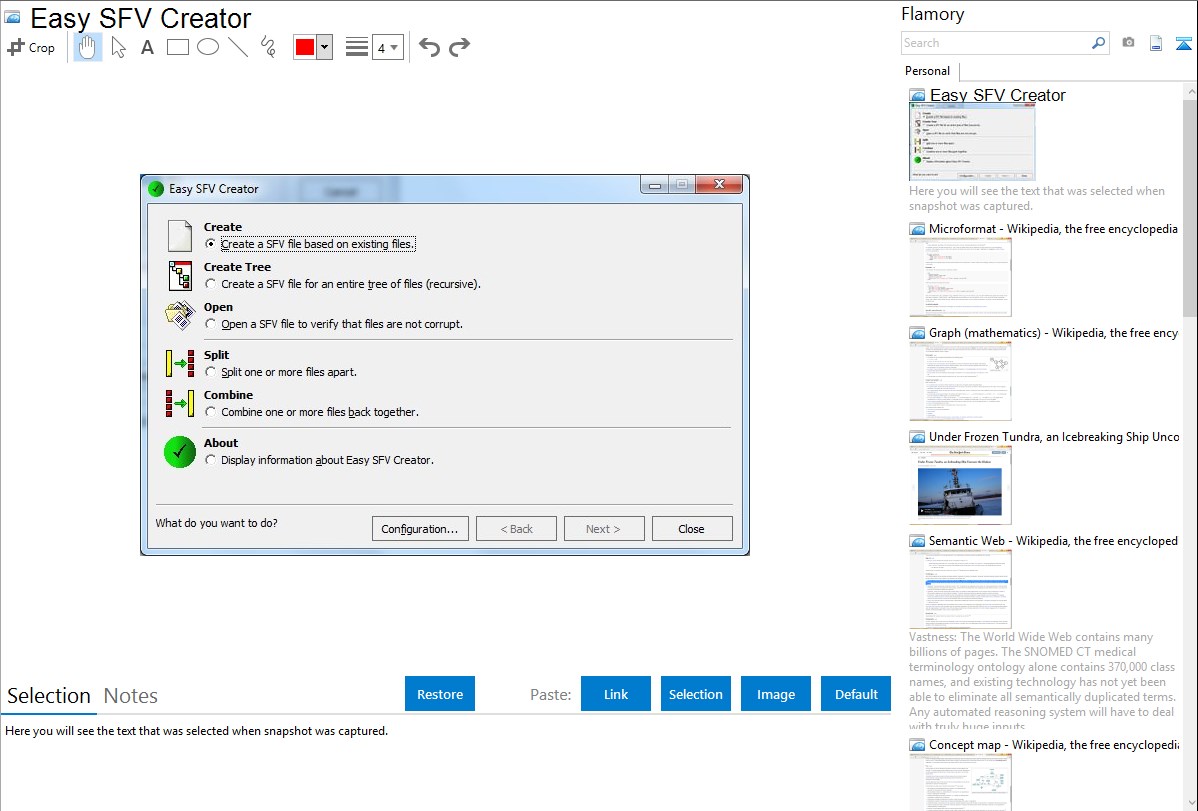 Flamory helps you capture and store screenshots from Easy SFV Creator by pressing a single hotkey. It will be saved to a history, so you can continue doing your tasks without interruptions. Later, you can edit the screenshot: crop, resize, add labels and highlights. After that, you can paste the screenshot into any other document or e-mail message.
