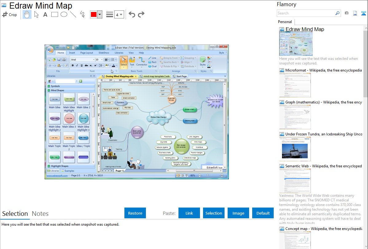 Flamory helps you capture and store screenshots from Edraw Mind Map by pressing a single hotkey. It will be saved to a history, so you can continue doing your tasks without interruptions. Later, you can edit the screenshot: crop, resize, add labels and highlights. After that, you can paste the screenshot into any other document or e-mail message.