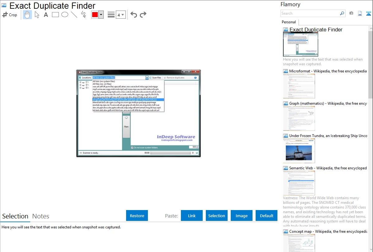 Flamory helps you capture and store screenshots from Exact Duplicate Finder by pressing a single hotkey. It will be saved to a history, so you can continue doing your tasks without interruptions. Later, you can edit the screenshot: crop, resize, add labels and highlights. After that, you can paste the screenshot into any other document or e-mail message.