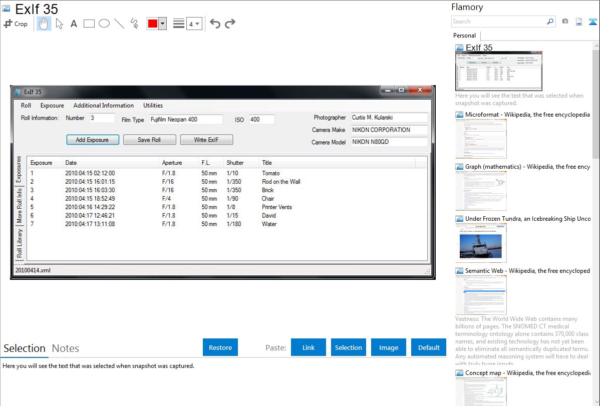 Flamory helps you capture and store screenshots from ExIf 35 by pressing a single hotkey. It will be saved to a history, so you can continue doing your tasks without interruptions. Later, you can edit the screenshot: crop, resize, add labels and highlights. After that, you can paste the screenshot into any other document or e-mail message.