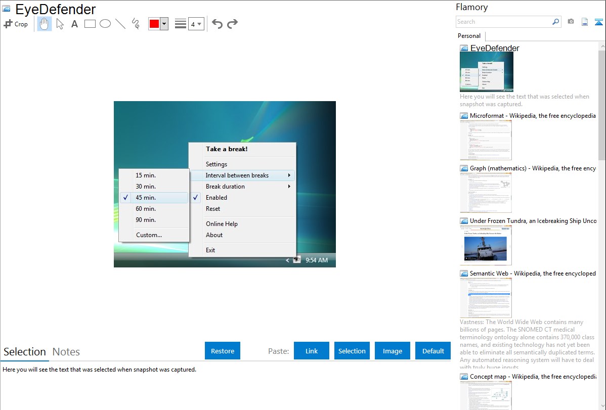 Flamory helps you capture and store screenshots from EyeDefender by pressing a single hotkey. It will be saved to a history, so you can continue doing your tasks without interruptions. Later, you can edit the screenshot: crop, resize, add labels and highlights. After that, you can paste the screenshot into any other document or e-mail message.