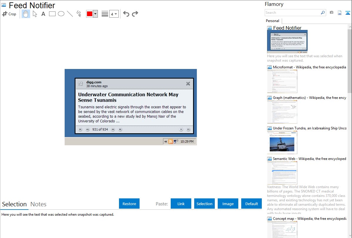 Flamory helps you capture and store screenshots from Feed Notifier by pressing a single hotkey. It will be saved to a history, so you can continue doing your tasks without interruptions. Later, you can edit the screenshot: crop, resize, add labels and highlights. After that, you can paste the screenshot into any other document or e-mail message.