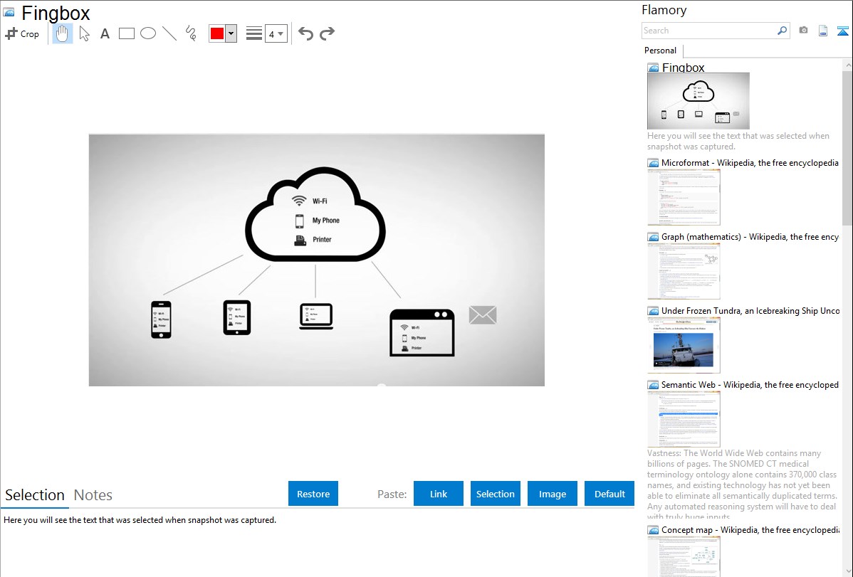 Flamory helps you capture and store screenshots from Fingbox by pressing a single hotkey. It will be saved to a history, so you can continue doing your tasks without interruptions. Later, you can edit the screenshot: crop, resize, add labels and highlights. After that, you can paste the screenshot into any other document or e-mail message.