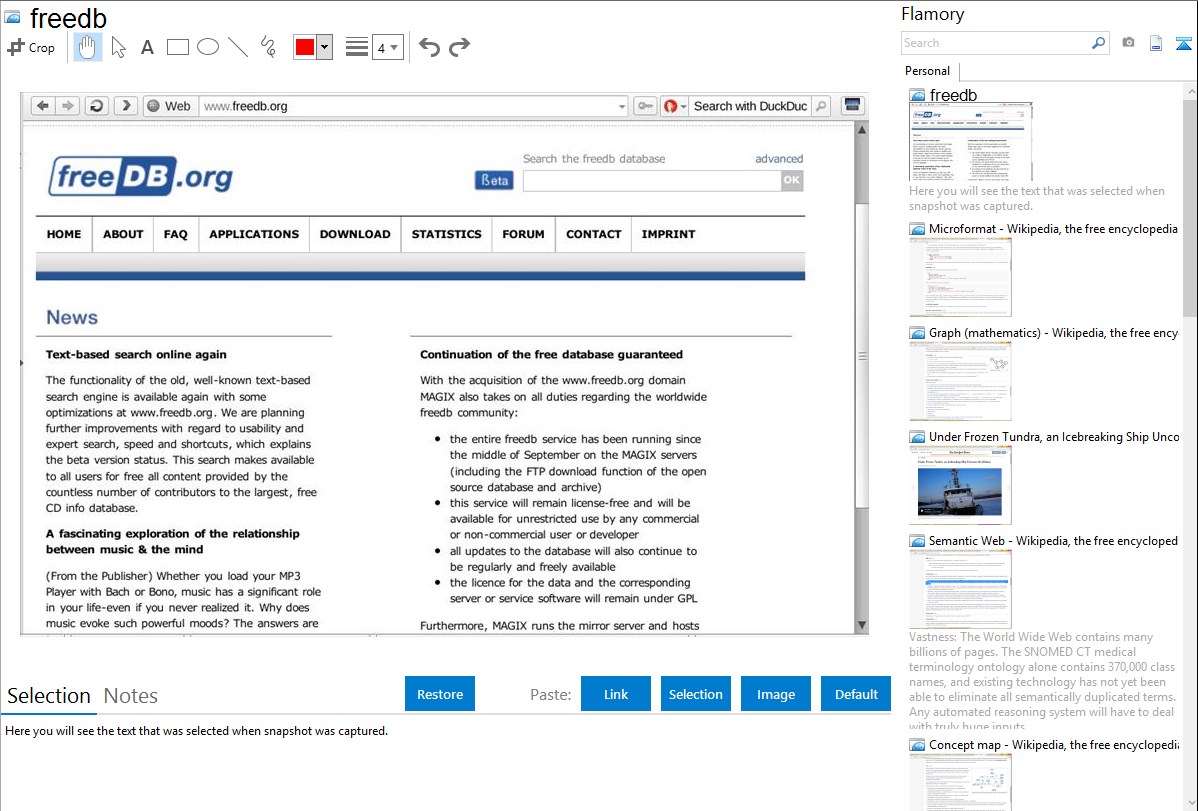 Flamory helps you capture and store screenshots from freedb by pressing a single hotkey. It will be saved to a history, so you can continue doing your tasks without interruptions. Later, you can edit the screenshot: crop, resize, add labels and highlights. After that, you can paste the screenshot into any other document or e-mail message.
