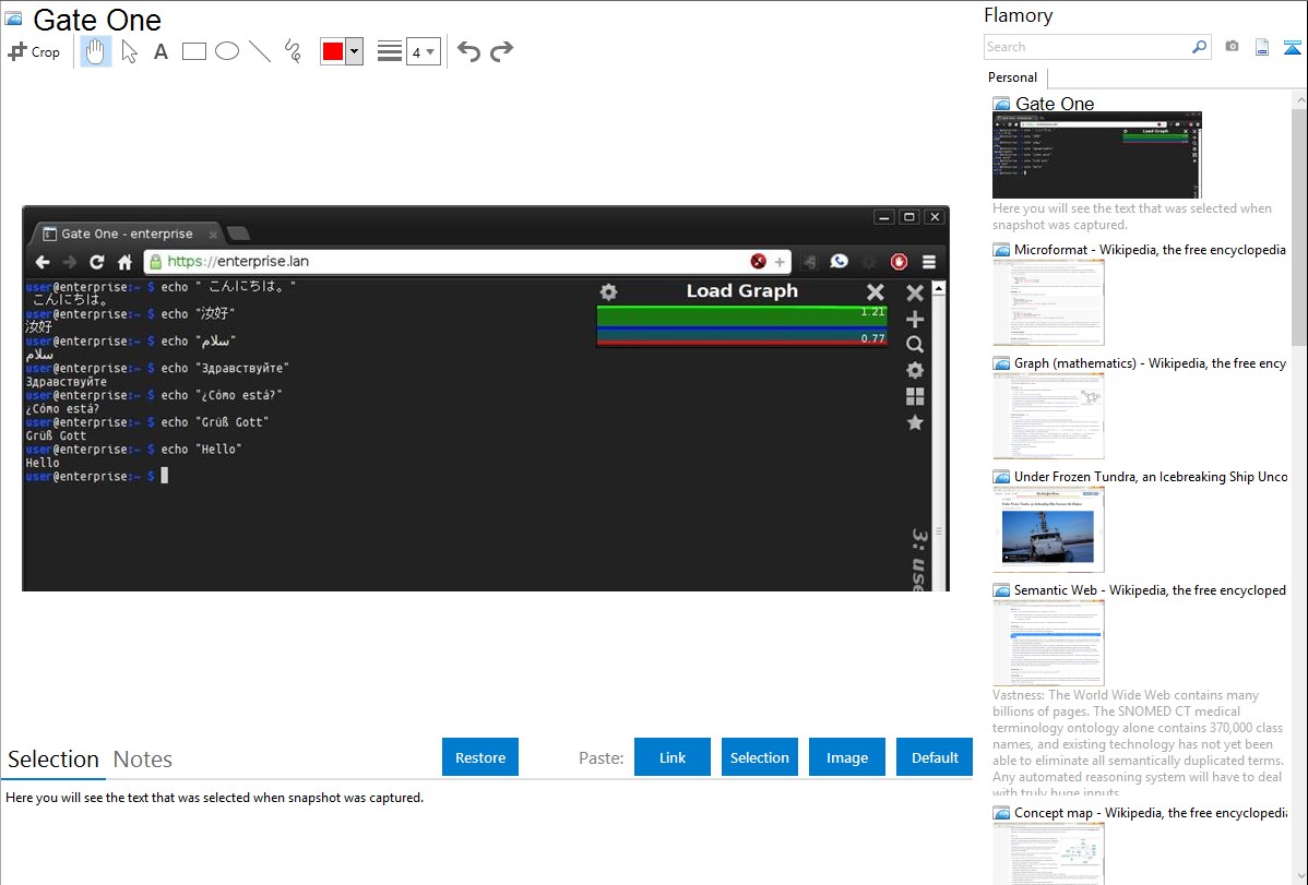 Flamory helps you capture and store screenshots from Gate One by pressing a single hotkey. It will be saved to a history, so you can continue doing your tasks without interruptions. Later, you can edit the screenshot: crop, resize, add labels and highlights. After that, you can paste the screenshot into any other document or e-mail message.