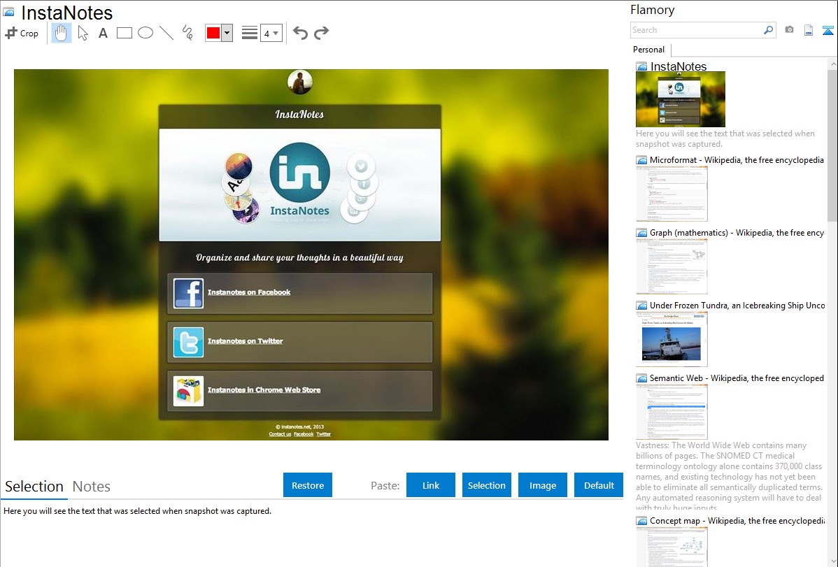 Flamory helps you capture and store screenshots from InstaNotes by pressing a single hotkey. It will be saved to a history, so you can continue doing your tasks without interruptions. Later, you can edit the screenshot: crop, resize, add labels and highlights. After that, you can paste the screenshot into any other document or e-mail message.