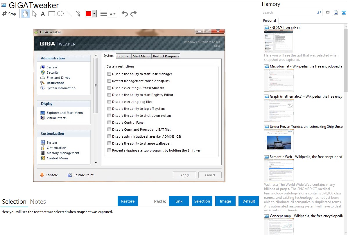 Flamory helps you capture and store screenshots from GIGATweaker by pressing a single hotkey. It will be saved to a history, so you can continue doing your tasks without interruptions. Later, you can edit the screenshot: crop, resize, add labels and highlights. After that, you can paste the screenshot into any other document or e-mail message.