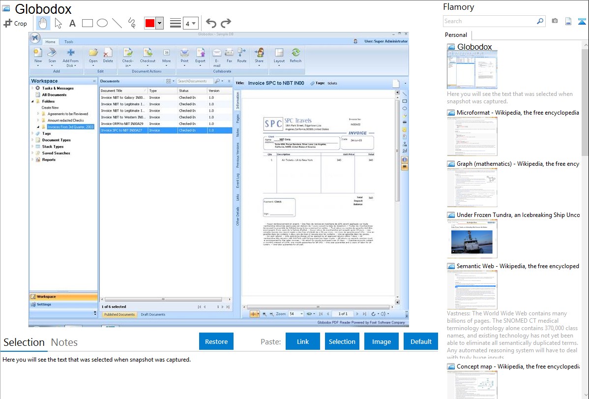 Flamory helps you capture and store screenshots from Globodox by pressing a single hotkey. It will be saved to a history, so you can continue doing your tasks without interruptions. Later, you can edit the screenshot: crop, resize, add labels and highlights. After that, you can paste the screenshot into any other document or e-mail message.