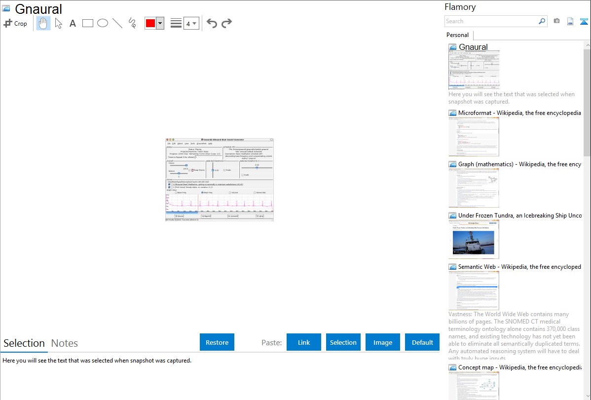 Flamory helps you capture and store screenshots from Gnaural by pressing a single hotkey. It will be saved to a history, so you can continue doing your tasks without interruptions. Later, you can edit the screenshot: crop, resize, add labels and highlights. After that, you can paste the screenshot into any other document or e-mail message.