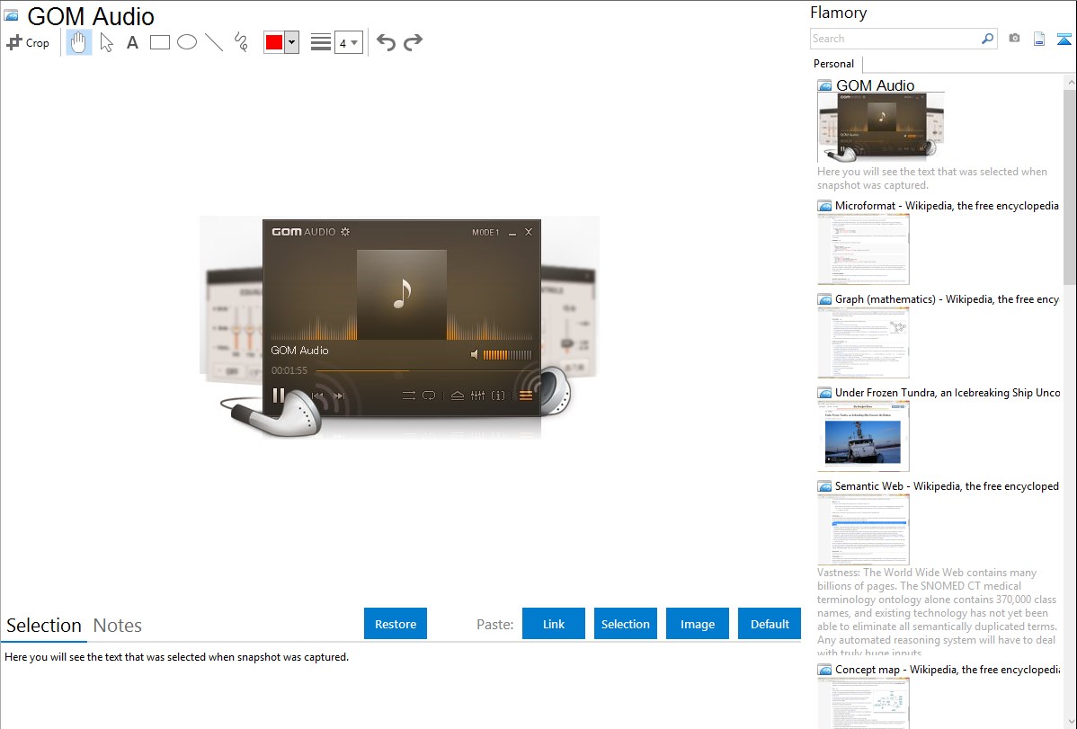 Flamory helps you capture and store screenshots from GOM Audio by pressing a single hotkey. It will be saved to a history, so you can continue doing your tasks without interruptions. Later, you can edit the screenshot: crop, resize, add labels and highlights. After that, you can paste the screenshot into any other document or e-mail message.
