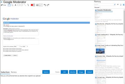 Flamory helps you capture and store screenshots from Google Moderator by pressing a single hotkey. It will be saved to a history, so you can continue doing your tasks without interruptions. Later, you can edit the screenshot: crop, resize, add labels and highlights. After that, you can paste the screenshot into any other document or e-mail message.