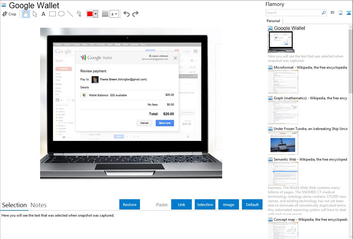 Flamory helps you capture and store screenshots from Google Wallet by pressing a single hotkey. It will be saved to a history, so you can continue doing your tasks without interruptions. Later, you can edit the screenshot: crop, resize, add labels and highlights. After that, you can paste the screenshot into any other document or e-mail message.