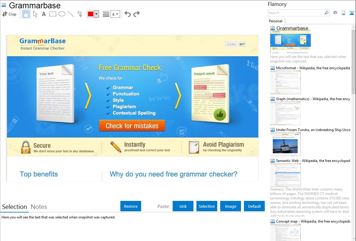 Flamory helps you capture and store screenshots from Grammarbase by pressing a single hotkey. It will be saved to a history, so you can continue doing your tasks without interruptions. Later, you can edit the screenshot: crop, resize, add labels and highlights. After that, you can paste the screenshot into any other document or e-mail message.