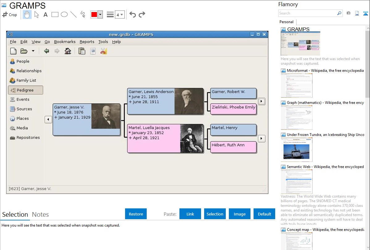 Flamory helps you capture and store screenshots from GRAMPS by pressing a single hotkey. It will be saved to a history, so you can continue doing your tasks without interruptions. Later, you can edit the screenshot: crop, resize, add labels and highlights. After that, you can paste the screenshot into any other document or e-mail message.